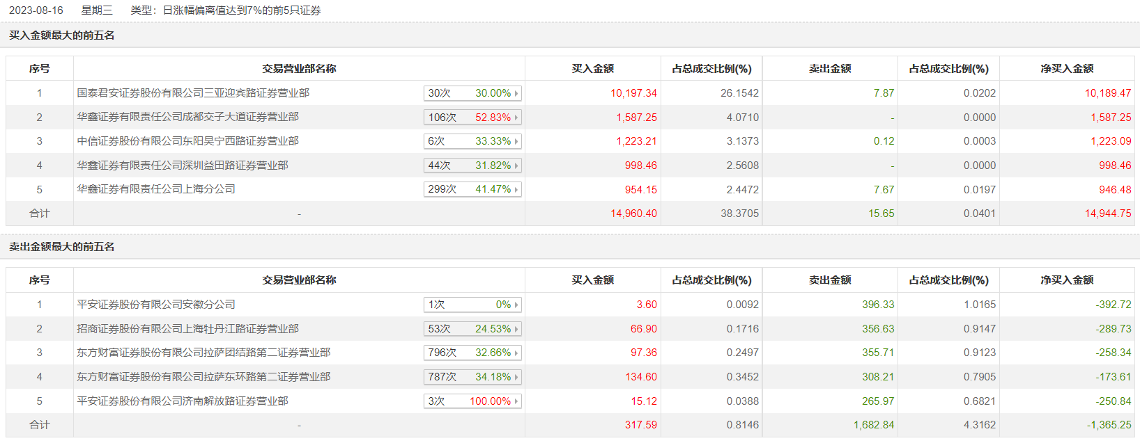 具体来看,国泰君安证券三亚迎宾路证券营业部、华鑫证券成都交子大道证券营业部分别买入1.02亿元、1587.25万元;平安证券安徽分公司、招商证券上海牡丹江路证券营业部分别卖出396.33万元、356.63万元。