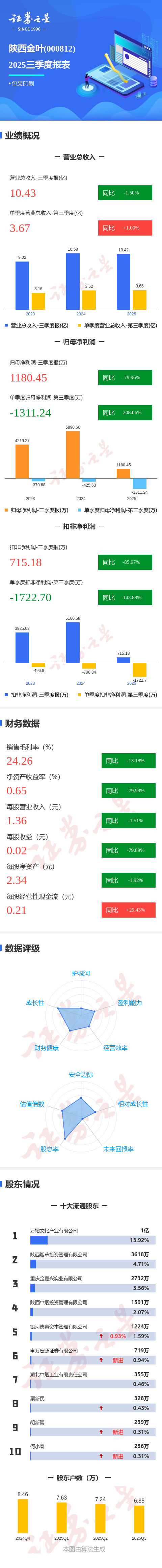 证券之星消息,陕西金叶2025年三季报显示,公司主营收入10.43亿元,同比下降1.51%;归母净利润1180.45万元,同比下降79.96%;扣非净利润715.18万元,同比下降85.98%;其中2025年第三季度,公司单季度主营收入3.67亿元,同比上升1.0%;单季度归母净利润-1311.24万元,同比下降208.06%;单季度扣非净利润-1722.7万元,同比下降143.89%;负债率67.8%,投资收益-55.31万元,财务费用7560.75万元,毛利率24.26%。