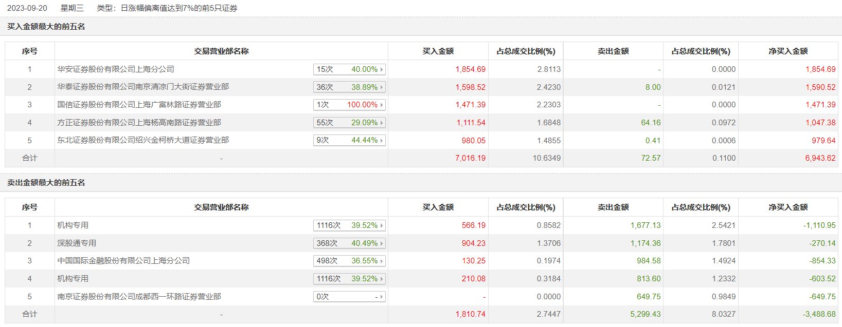 9月20日,德展健康今日涨停,龙虎榜数据显示,上榜营业部席位全天成交1.42亿元,占当日总成交金额比例为21.52%。其中,买入金额为8826.94万元,卖出金额为5372.0万元,合计净买入3454.94万元。