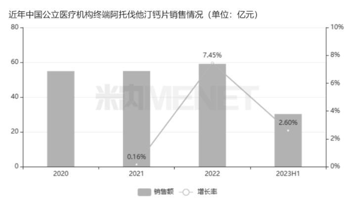 根据米内网数据显示,阿托伐他汀钙片在近年中国公立医疗机构终端市场规模均超过50亿元,2022年销售额同比增长7.45%,2023年上半年同比增长2.60%,是心脑血管系统化药TOP1产品。