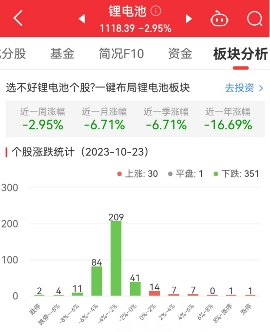 中国经济网北京10月23日讯今日,锂电池板块整体跌幅2.95%,其中30只股票上涨,1只股票平盘,351只股票下跌。