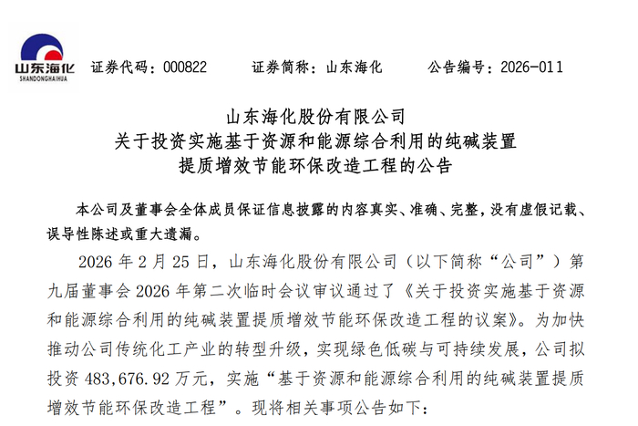 据深交所官网消息,2026年2月25日,山东海化股份有限公司(证券代码:000822)发布《关于投资实施基于资源和能源综合利用的纯碱装置提质增效节能环保改造工程的公告》,表示为加快推动传统化工产业转型升级,实现绿色低碳与可持续发展,公司拟投资48.37亿元,实施“基于资源和能源综合利用的纯碱装置提质增效节能环保改造工程”。