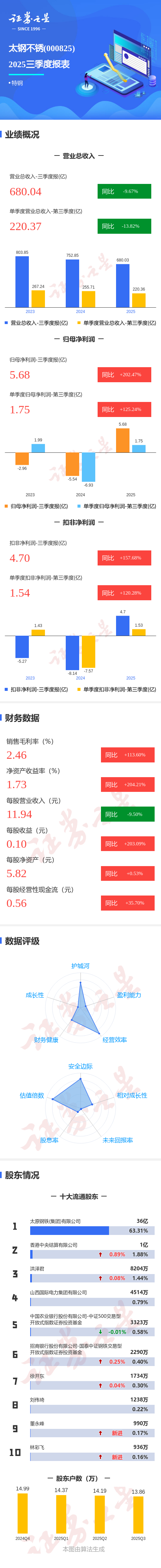 证券之星消息,太钢不锈2025年三季报显示,前三季度公司主营收入680.04亿元,同比下降9.67%;归母净利润5.68亿元,同比上升202.48%;扣非净利润4.7亿元,同比上升157.68%;其中2025年第三季度,公司单季度主营收入220.37亿元,同比下降13.82%;单季度归母净利润1.75亿元,同比上升125.25%;单季度扣非净利润1.54亿元,同比上升120.28%;负债率46.36%,投资收益1.08亿元,财务费用8893.05万元,毛利率2.46%。