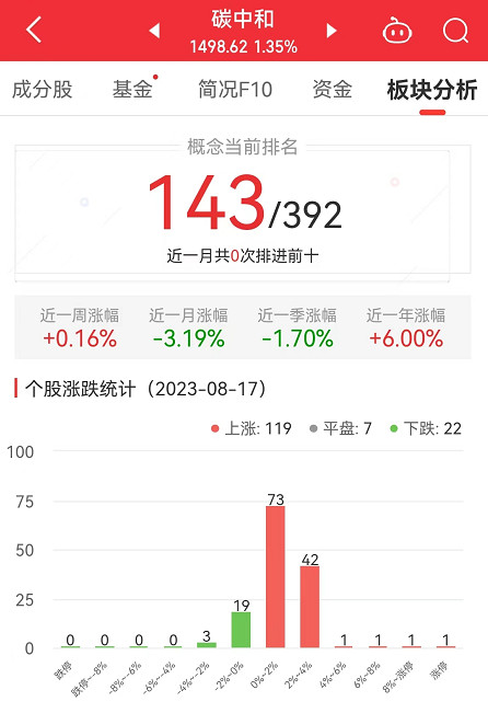 中国经济网北京8月17日讯 今日,碳中和板块整体涨幅1.35%,其中,119只股票上涨,7只股票平盘,22只股票下跌。