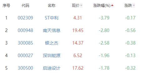 ST中利(维权)、南天信息、银之杰、深圳能源、启迪设计位列涨幅榜后五位,涨幅分别为-3.79%、-2.80%、-2.58%、-1.96%、-1.78%。