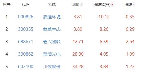 其中,启迪环境(维权)、蒙草生态、碧兴物联、蓝盾光电、川仪股份位列板块涨幅前五位,涨幅分别为10.12%、8.26%、6.59%、4.05%、3.84%。