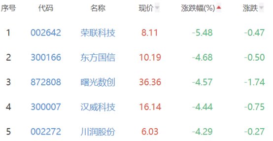 荣联科技、东方国信、曙光数创、汉威科技、川润股份位列涨幅榜后五位,涨幅分别为-5.48%、-4.68%、-4.57%、-4.44%、-4.29%。
