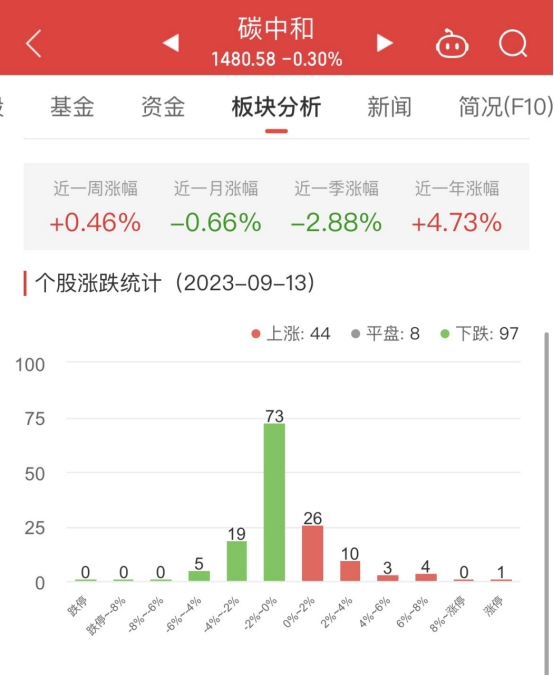 中国经济网北京9月13日讯今日,碳中和板块整体涨幅-0.3%,其中44只股票上涨,8只股票平盘,97只股票下跌。