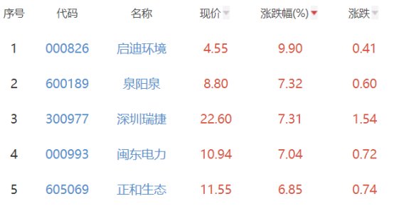 其中,启迪环境、泉阳泉、深圳瑞捷、闽东电力、正和生态位列板块涨幅前五位,涨幅分别为9.90%、7.32%、7.31%、7.04%、6.85%。