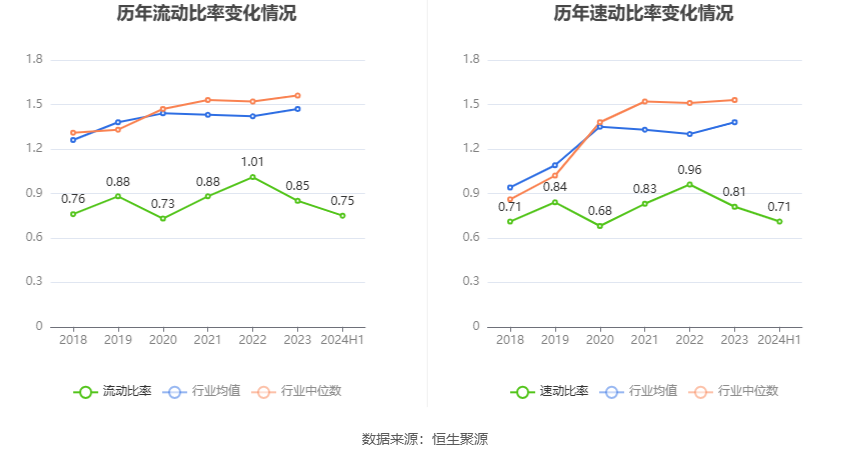 2024年上半年,公司流动比率为0.75,速动比率为0.71。