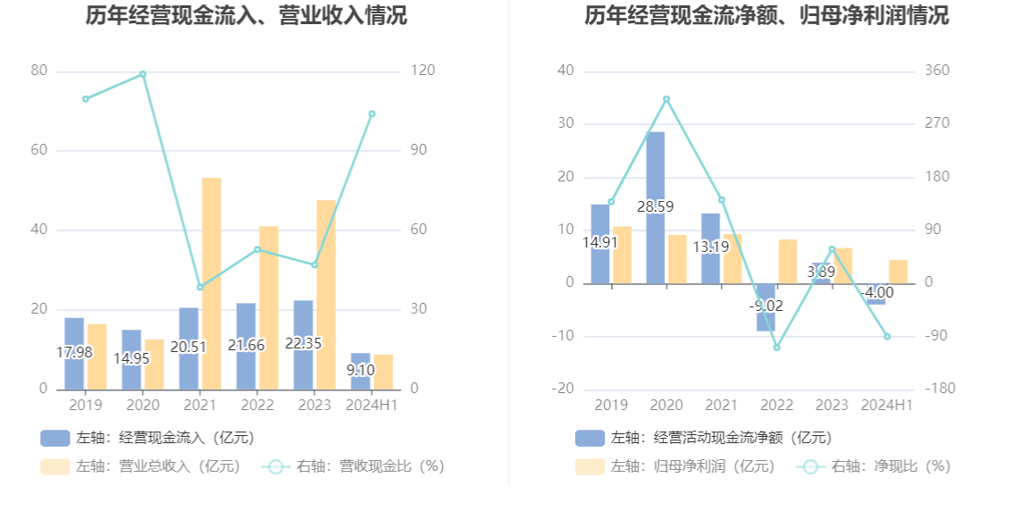 进一步统计发现,2024年上半年公司自由现金流为-47.37亿元,上年同期为-18.96亿元。