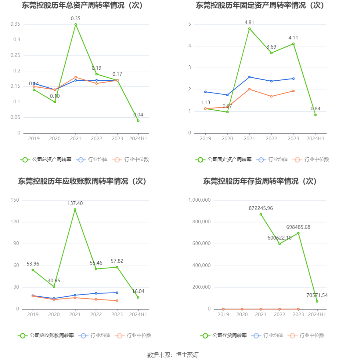 营运能力方面,2024年上半年,公司公司总资产周转率为0.04次,上年同期为0.07次(2023年上半年行业平均值为0.08次,公司位居同行业11/19);固定资产周转率为0.84次,上年同期为1.63次(2023年上半年行业平均值为1.05次,公司位居同行业7/19);公司应收账款周转率、存货周转率分别为16.04次、70571.54次。