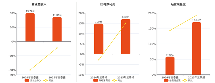公司营业总收入为11.84亿元。归母净利润为8.36亿元,在已披露的同业公司中排名第8,较去年同报告期归母净利润增加1.09亿元,同比较去年同期上涨15.01%。经营活动现金净流入为16.44亿元,在已披露的同业公司中排名第9,较去年同报告期经营活动现金净流入增加10.82亿元,实现3年连续上涨,同比较去年同期上涨192.21%。