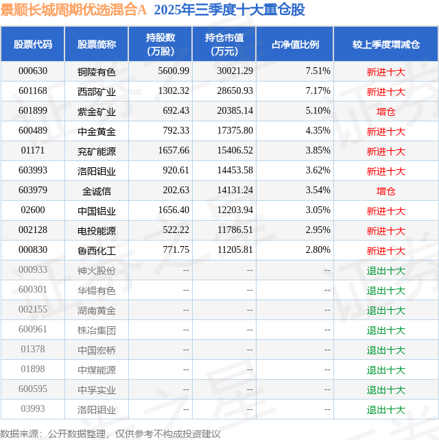 景顺长城周期优选混合A的前十大重仓股如下: