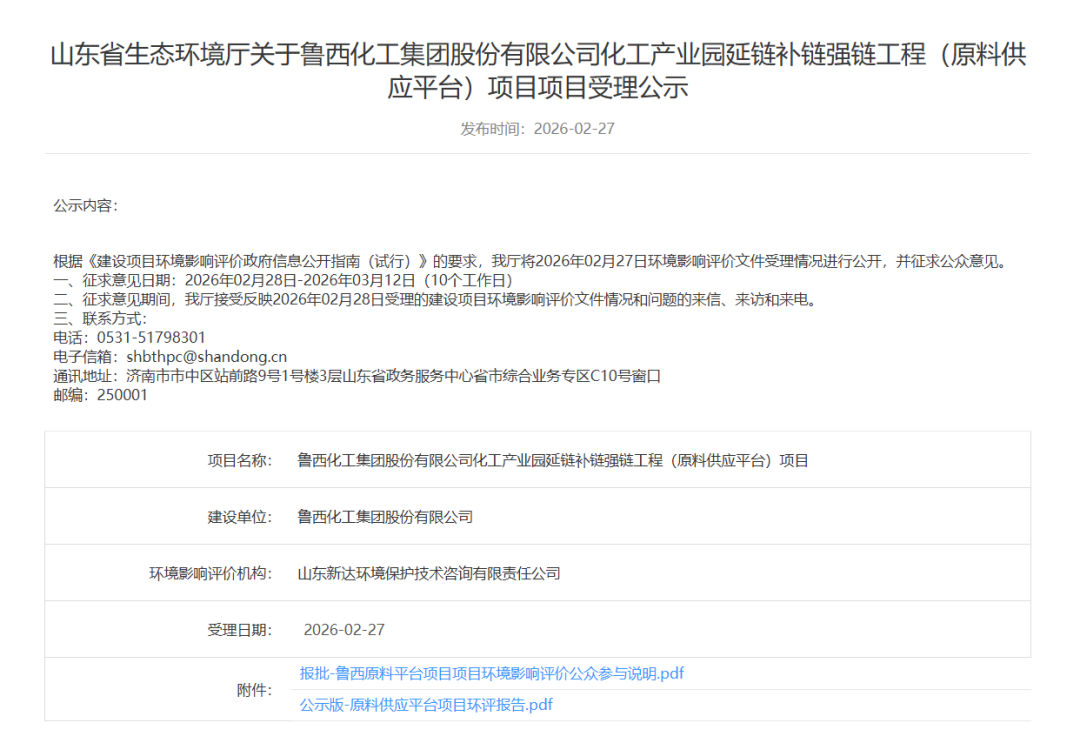 近期,山东省生态环境厅发布了鲁西化工集团股份有限公司化工产业园延链补链强链工程(原料供应平台)项目环境影响报告书受理的公示。