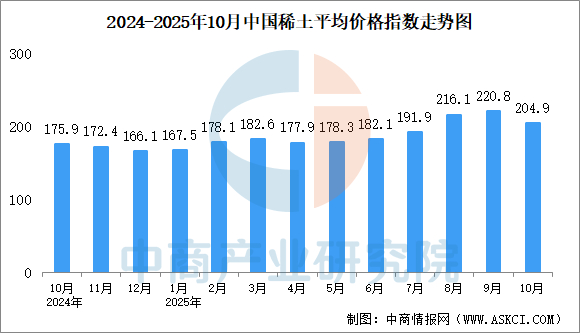 中商情报网讯:2025年10月,稀土价格指数总体呈现下行态势。本月平均价格指数为204.9点。价格指数最高为10月9日的217.4点,最低为10月24日的197.7点。高低点相差19.7点,波动幅度约为9.6%。
