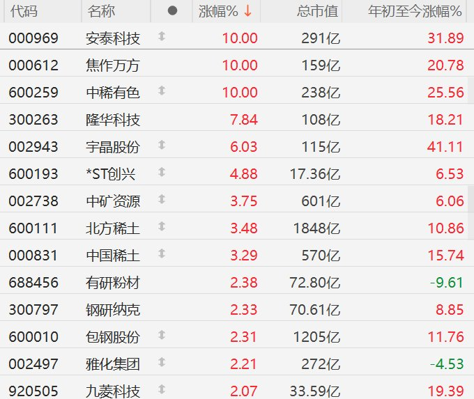 A股稀土永磁概念股普涨,北方稀土、中国稀土涨超3%