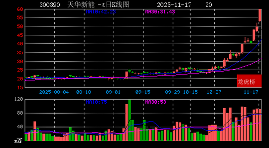 截止收盘,天华新能报收59.77元/股,涨幅20.0%,成交量90万手,成交额51.02亿元,换手率13.39%。今日1板。