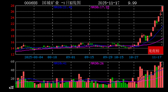 截止收盘,国城矿业报收27.74元/股,涨幅9.99%,成交量46万手,成交额12.65亿元,换手率4.1%。今日1板。
