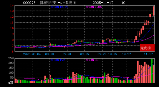 截止收盘,佛塑科技报收13.75元/股,涨幅10.0%,成交量180万手,成交额23.87亿元,换手率18.69%。今日1板。