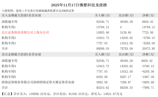买入前5席为:深股通专用、机构专用1、长江证券股份有限公司上海分公司、机构专用2、机构专用3。共计买入:95856.03万元,共计卖出:75783.09万元。