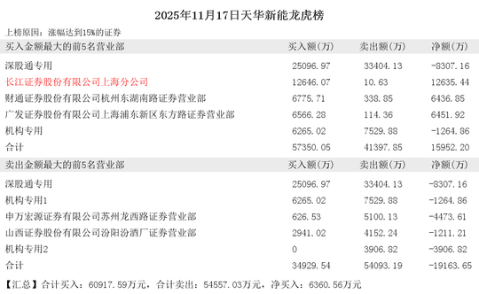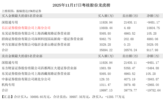 买入前5席为:深股通专用、长江证券股份有限公司上海分公司、财通证券股份有限公司杭州东湖南路证券营业部、广发证券股份有限公司上海浦东新区东方路证券营业部、机构专用。共计买入:57350.05万元,共计卖出:41397.85万元。