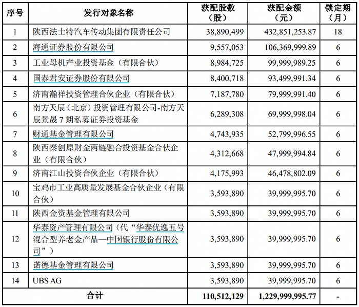 秦川机床7月3日发布定增结果公告,本次发行价格为11.13元/股,发行股数为110,512,129股,募集资金总额为12.30亿元。其中控股股东法士特集团获配4.33亿元,海通证券获配1.06亿元,国泰君安获配9350.00万元。新增股份的上市时间为2023年7月7日,上市地点为深交所。