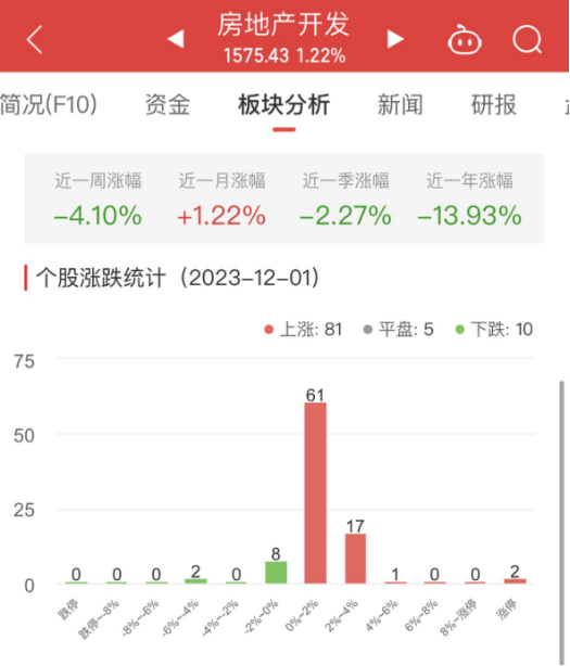 中国经济网北京12月1日讯今日,房地产开发板块整体涨幅1.22%,其中81只股票上涨,5只股票平盘,10只股票下跌。