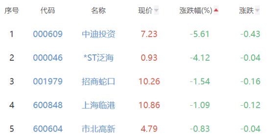 中迪投资、*ST泛海、招商蛇口、上海临港、市北高新位列板块涨幅榜后五位,涨幅分别为-5.61%、-4.12%、-1.54%、-1.09%、-0.83%。