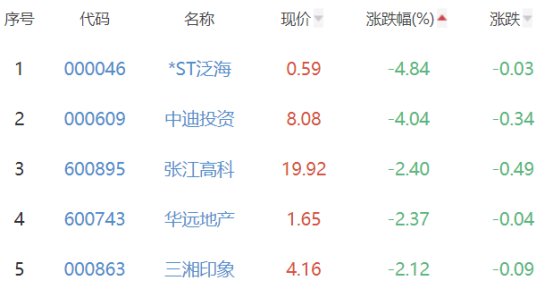 *ST泛海、中迪投资、张江高科、华远地产、三湘印象位列板块涨幅榜后五位,涨幅分别为-4.84%、-4.04%、-2.40%、-2.37%、-2.12%。