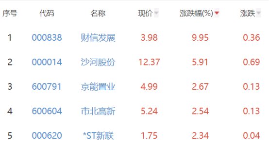 其中,财信发展、沙河股份、京能置业、市北高新、*ST新联位列板块涨幅榜前五位,涨幅分别为9.95%、5.91%、2.67%、2.54%、2.34%。