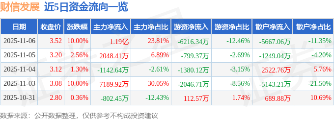证券之星消息,财信发展11月6日涨停收盘,收盘价3.52元。该股于13点56分涨停,2次打开涨停,截止收盘封单资金为3254.28万元,占其流通市值0.88%。
