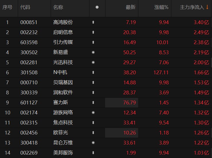 14只个股主力资金净流入额超1亿元 高鸿股份净流入超3亿元居首