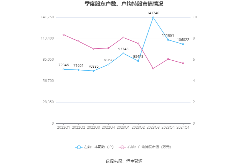 筹码集中度方面,截至2024年一季度末,公司股东总户数为10.6万户,较上年末下降了5869户,降幅5.25%;户均持股市值由上年末的6.07万元下降至5.68万元,降幅为6.43%。
