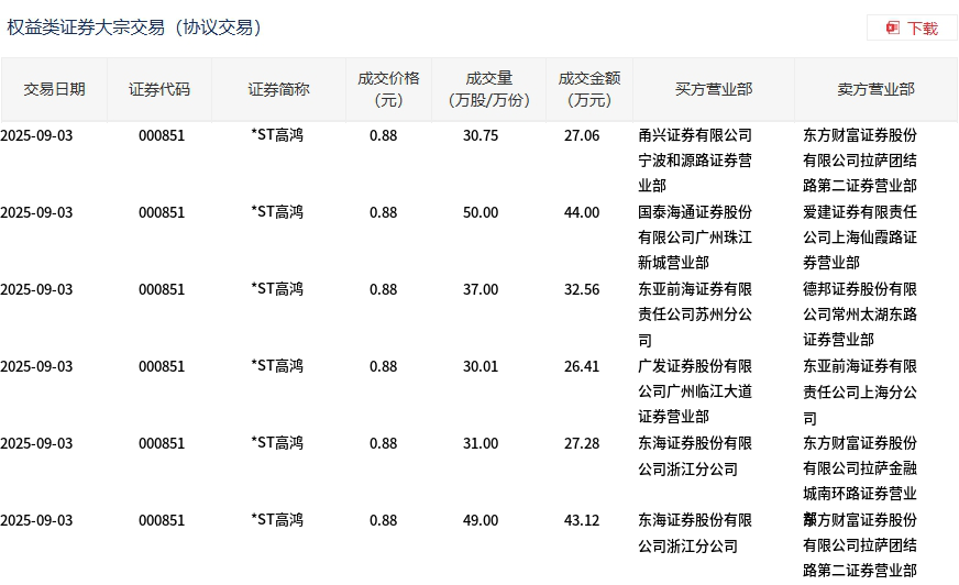 *ST高鸿今日大宗交易平价成交227.76万股,成交额200.43万元