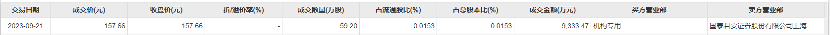 9月21日大宗交易成交59.2万股,成交额9333.47万元,占当日总成交额的4.36%,成交价157.66元,较市场收盘价157.66元持平。