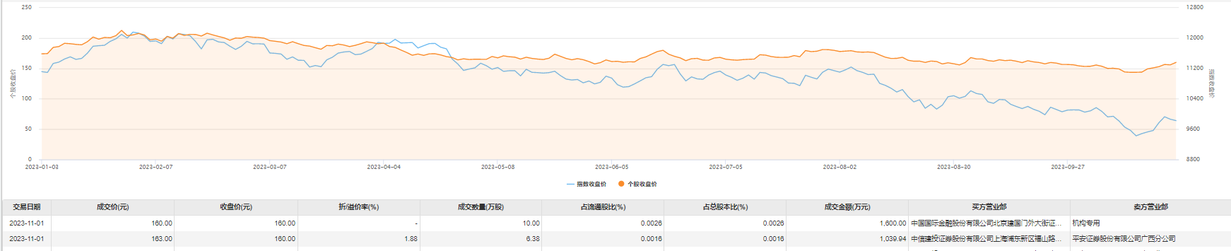 今日大宗交易成交16.38万股,成交额2639.94万元,占当日总成交额的0.35%,成交均价161.17元,较市场收盘价溢价0.73%,其中最高成交价163元,最低成交价160元。