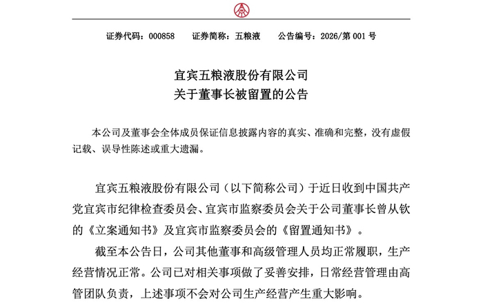 随后,五粮液发布公告:公司近日收到中国共产党宜宾市纪律检查委员会、宜宾市监察委员会出具的《立案通知书》和《留置通知书》,公司董事长曾从钦被留置。截至本公告日,公司其他董事和高级管理人员均正常履职,生产经营正常,公司已由高管团队负责日常经营,并将持续关注后续进展,及时履行信息披露义务。