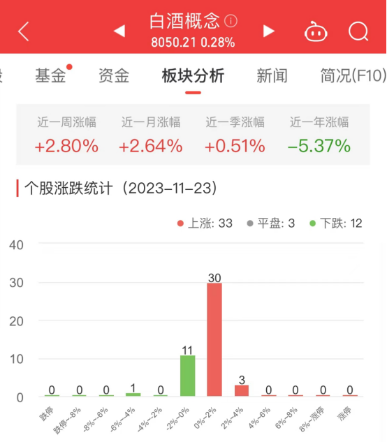 中国经济网北京11月23日讯今日,白酒概念板块整体涨幅0.28%,其中33只股票上涨,3只股票平盘,12只股票下跌。