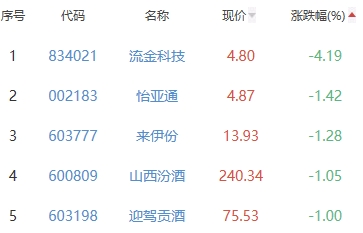 流金科技、怡亚通、来伊份、山西汾酒、迎驾贡酒位列涨幅榜后五位,涨幅分别为-4.19%、-1.42%、-1.28%、-1.05%、-1.00%。