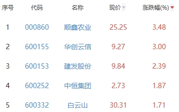 其中,顺鑫农业、华创云信、建发股份、中恒集团、白云山位列板块涨幅前五位,涨幅分别为3.48%、3.00%、2.39%、1.87%、1.71%。