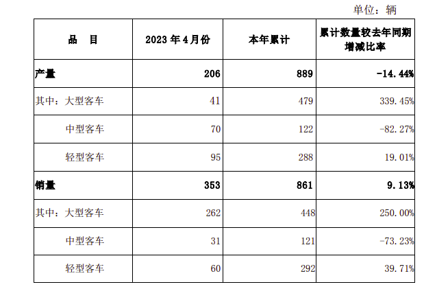 5月5日公告,公司4月销量353辆,本年累计销量861辆,本年累计销量同比增长9.13%。