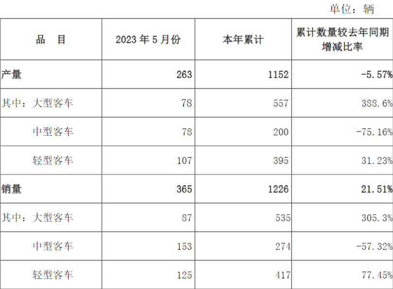 安凯客车:前5月客车销量合计1226辆,同比上涨21.51%