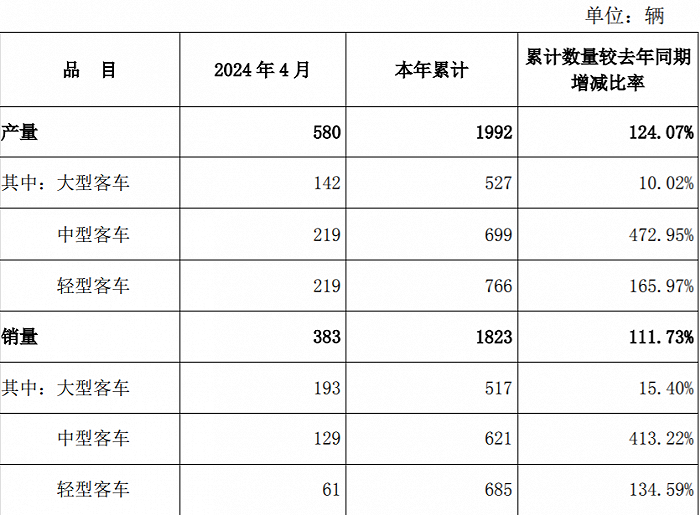 5月6日公告,公司前4月客车销量合计1823辆,同比上涨111.73%。