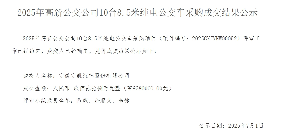 日前,2025年高新公交公司10台8.5米纯电公交车采购成交结果在安徽公共资源交易集团公示,成交人为安徽安凯汽车股份有限公司。公示详情如下:
