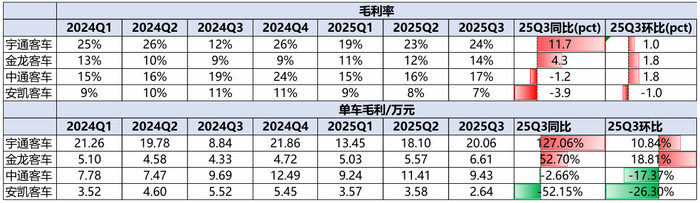 东吴证券(601555.SH)研报数据进一步印证了公司的盈利困境。以2025年Q3为例,宇通客车、金龙汽车、中通客车的毛利率分别为24%、14%、17%,单车毛利分别为20.06万元、6.61万元、9.43万元。同期安凯客车毛利率及单车毛利分别为7%、2.64万元。2025年以来,安凯客车的单车毛利均未超过4万元,且逐季走低,不及2024年逐季走高的整体表现。