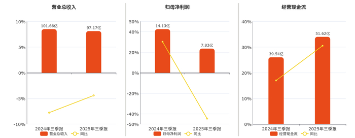 公司营业总收入为97.17亿元,较去年同报告期营业总收入减少4.50亿元,同比较去年同期下降4.42%。归母净利润为7.83亿元,较去年同报告期归母净利润减少6.31亿元,同比较去年同期下降44.63%。经营活动现金净流入为51.62亿元,较去年同报告期经营活动现金净流入增加12.08亿元,实现2年连续上涨,同比较去年同期上涨30.54%。