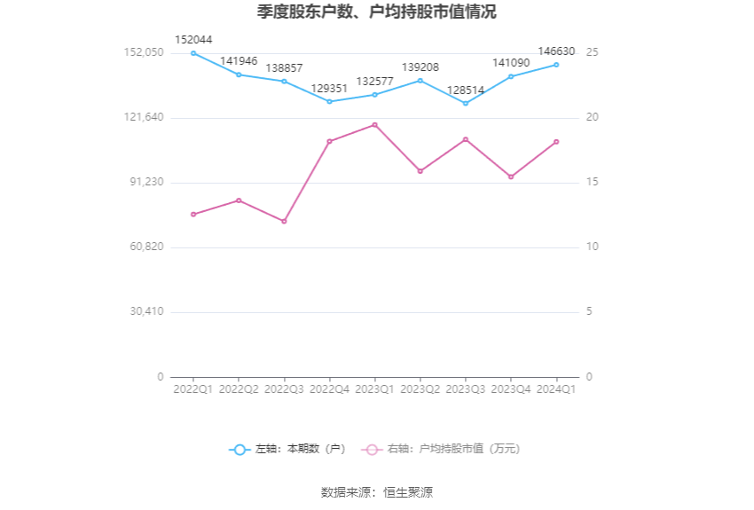 筹码集中度方面,截至2024年一季度末,公司股东总户数为14.66万户,较上年末增长了5540户,增幅3.93%;户均持股市值由上年末的15.46万元上升至18.17万元,增幅为17.53%。