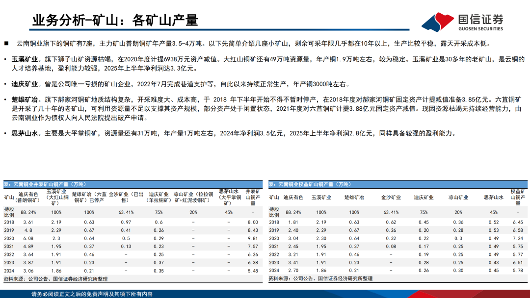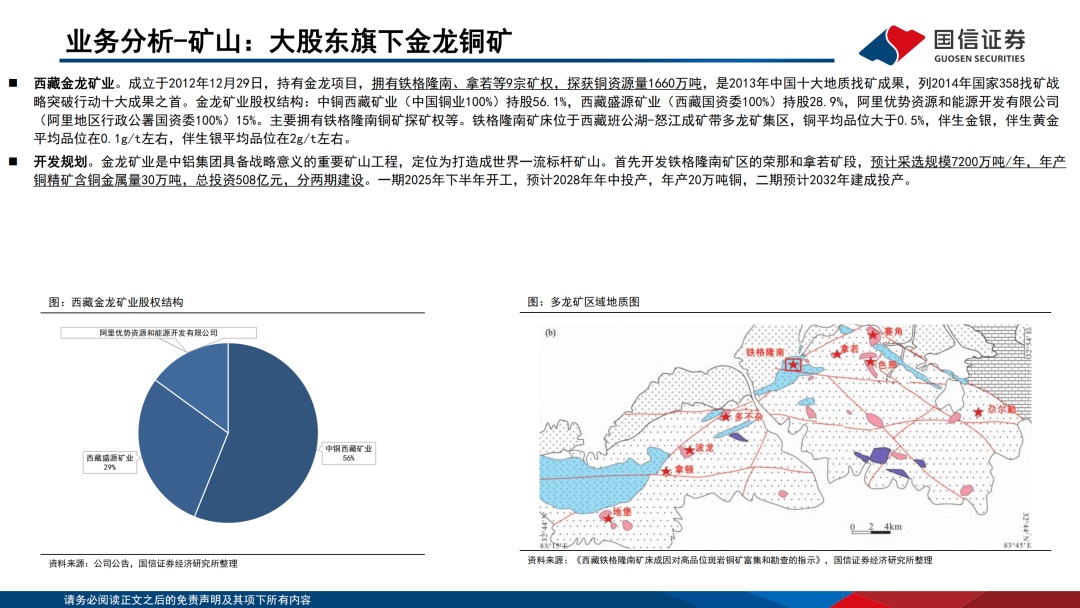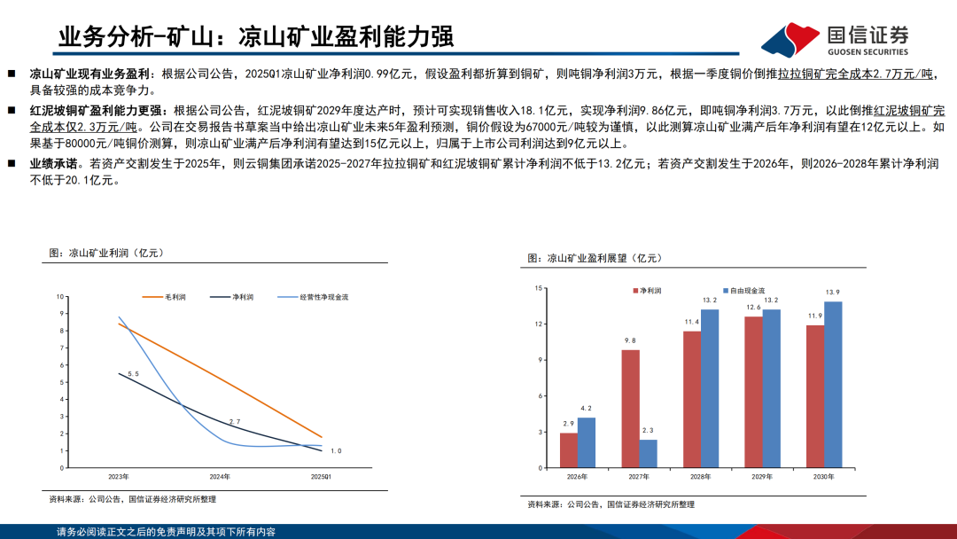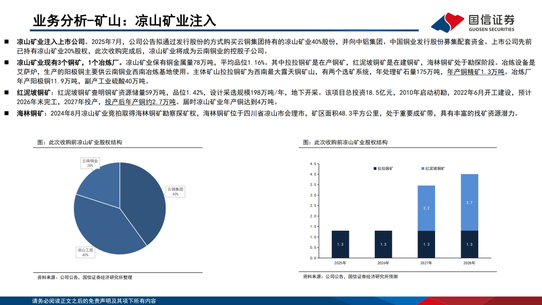 3.大股东优质资产注入。2025年7月,公司公告以发行股份的方式购买云铜集团持有的凉山矿业40%股份,并向中铝集团、中国铜业发行股份募集配套资金。凉山矿业旗下拉拉铜矿年产铜1.3万吨,红泥坡铜矿2027年投产后,凉山矿业矿山铜产量达到4万吨。资产注入完成后,上市公司将持有凉山矿业60%股权,公司并表矿山铜产量从6万吨增加到10万吨。中铝集团在西藏的巨型斑岩铜矿金龙铜矿将在2025年内开工,2028年投产,一期投产20万吨。