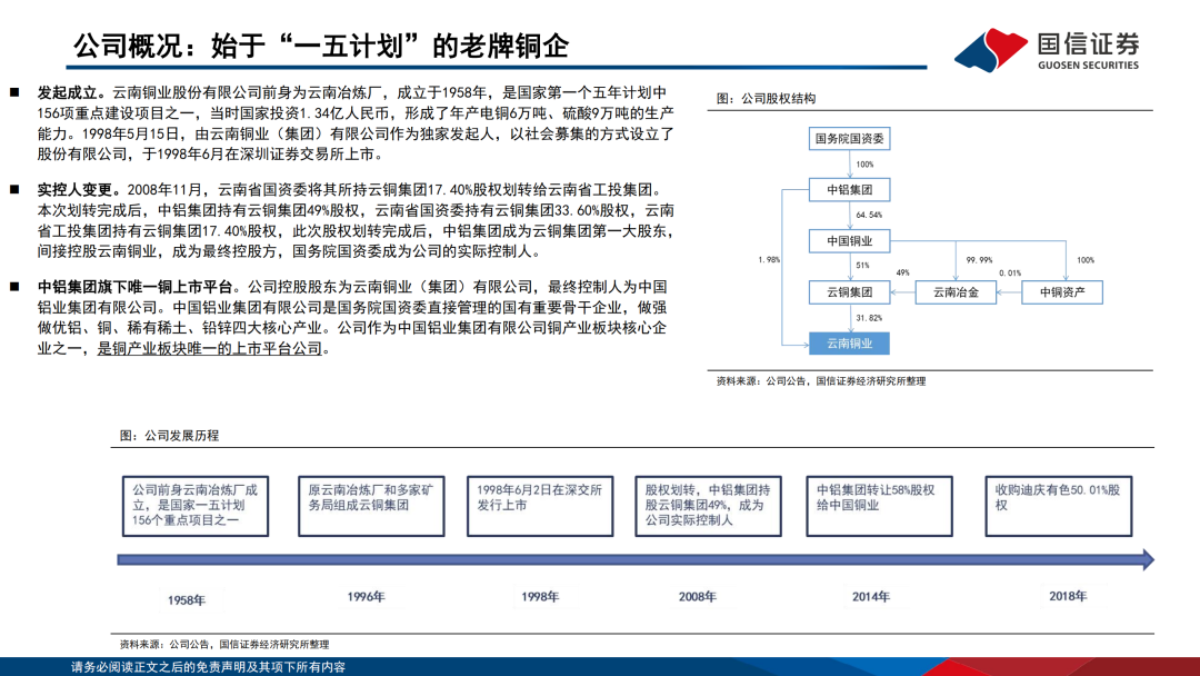 1.国内老牌铜企,中铝集团旗下唯一铜上市平台。云南铜业前身是国家“一五计划”重点建设项目,主要业务是铜的采选冶,冶炼产能140万吨,在国内仅次于铜陵有色和江西铜业,旗下矿山分布在云南、四川地区。公司是中国铝业集团有限公司铜产业板块核心企业之一,是铜产业板块唯一的上市平台公司。